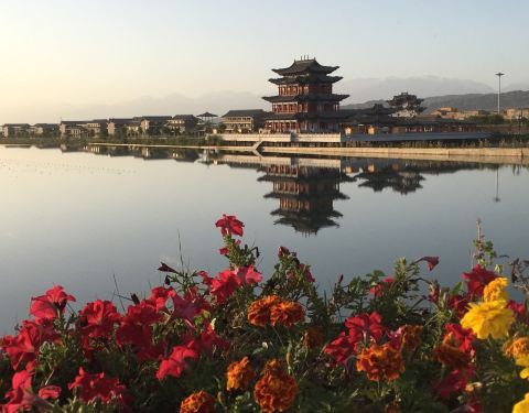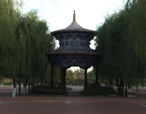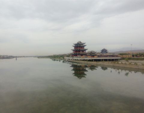 这里是嘉峪关市新建的面积最大的湿地公园,湖是人工修建的,到了晚上有喷泉和水幕电影。河岸边的仿古楼跟嘉峪关城楼遥相呼应,天气好的时候背后的雪山轮廓清晰,景色迷人。