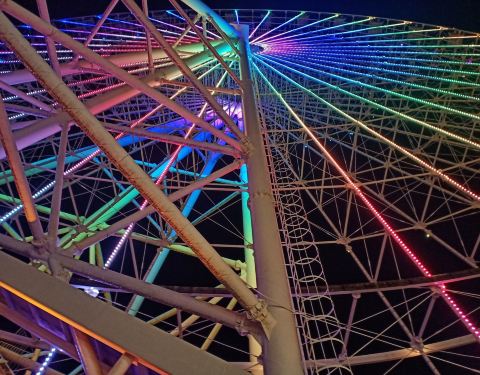 最最最喜欢的摩天轮 但是天公不作美那天天气阴沉沉的 感觉不适合坐摩天轮 而且绕道排队口发现人爆满 按这个速度我们大概要天黑才上去了吧