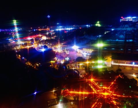 横店摩天轮在梦幻谷景区内,晚上开灯后非常的漂亮,过节的时候去的,因此人非常的多。排队好久才坐上摩天轮,在上面可以看到整个横店。