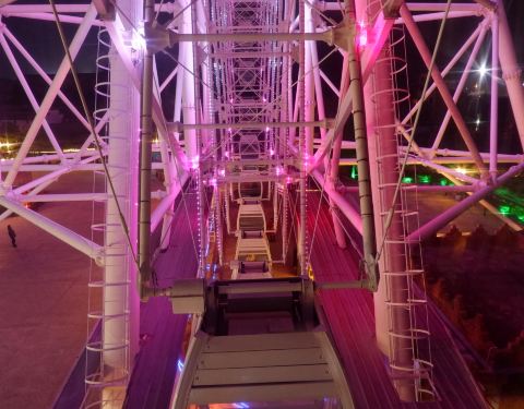 横店梦幻谷•摩天轮 这里貌似是限制性的,每人只能乘坐一次 但是淡季的时候,不知道是否可以多次排队来搭乘 小姐姐很好,基本上都会满足你想和谁一起乘坐,不会勉强你和不认识的人一起搭乘 关于摩天轮 传说摩天轮的每个盒子里都装满了[爱心]幸福 当我们仰望摩天轮的时候 就是在仰望[爱心]幸福 幸福有多高 摩天轮就有多高 当然更多的是关于他的浪漫传说 恋人在至高点接吻,他们就会永远的在一起 一个浪漫的传说吧 梦幻谷的摩天轮至高点 可以看到整个梦幻谷,只是冬天了水上世界没有亮灯 现在只能看到游乐园区的灯光