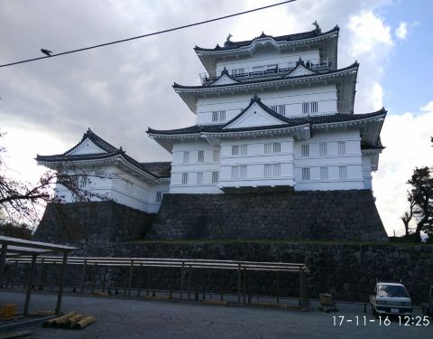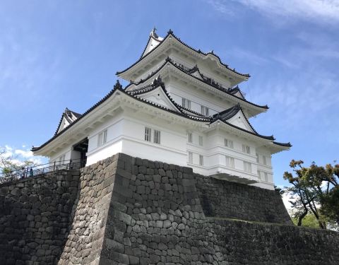 虽然因历史原因几近废城,但其三层四阶的天守阁依旧保存完好,城阁内展示有甲胄、刀剑、旧卷宗文书等历史资料。登上天守阁还能一览箱根山及相模湾的壮丽美景。