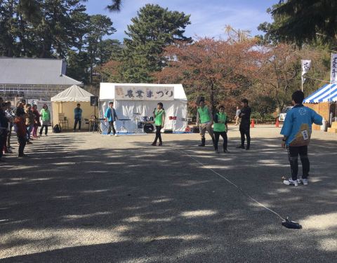小田原城址公园有农业祭,好多农产品还有各种体验项目:比如拿草编造型、在橘子皮上作画,摸小牛(提供酒精给手消毒)和介绍母牛品种并照相等…还有他们的比赛项目竟然是每发个橘子排队把肉吃完