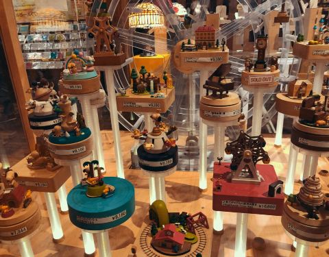 值得一看小樽音乐盒馆2号馆,位于童话十字路口一角,门口是小樽地标之一蒸气钟,本以为是博物馆,其实里面就是玻璃制品和音乐盒的大超市。值得一看!