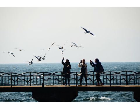 这里是观鸟的好地方,许多游人向鸟儿扔面包渣,海鸥候鸟漫天飞舞,场面非常壮观。