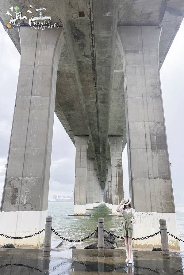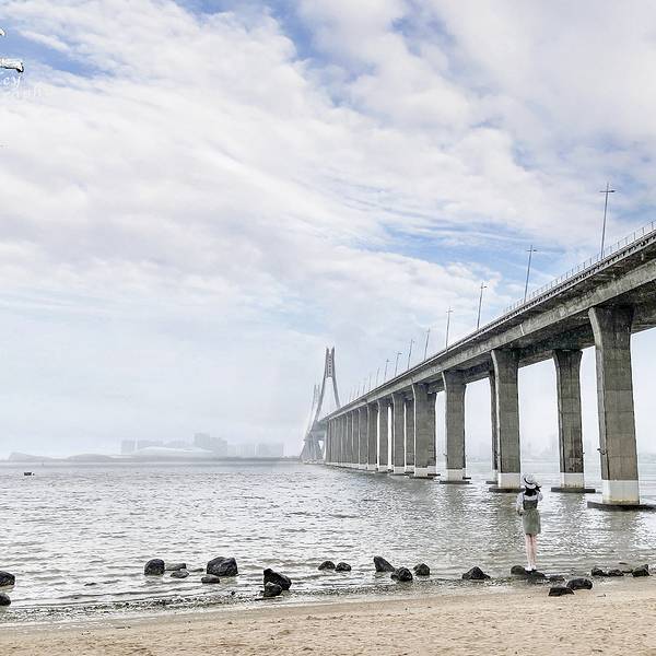 映衬着渺小的我……在这里拍照出片率挺高的,放眼望去,对岸建筑、越麻斜海湾、桥梁汇成一张好看的明信片…夏天的浪漫,就是突然下了一场雷暴雨,而我们在桥底下撑着伞,从阴云等到天晴 ……眼前海湾大桥桥底对称式的桥墩,成为了网红必打卡点。站在马路边望着一眼望不到尽头、层层叠叠对称结构十足的桥墩,会有一种...夏天的浪漫,就是突然下了一场雷暴雨,而我们在桥底下撑着伞,从阴云等到天晴 ……眼前海湾大桥桥底对称式的桥墩,成为了网红必打卡点。站在马路边望着一眼望不到尽头、层层叠叠对称结构十足的桥墩,会有一种未知的神秘与好奇的感觉。总觉得如果可以走过去,尽头有可能是另一个世界,就像大海之门无限延伸的即视感!在冒雨拍的时候,意外有一艘货船驶过桥墩之间,被我捕抓了下来。看着这张独特视觉效果的照片,虚虚实实间,给人一种魔幻的穿越感的同时,也有眼前一亮的感觉……有一段时间雨下得超级大,海面浮现了一层朦胧的雨雾,盯着对称式的桥墩和雨雾,忽然那一刹那有种会传送到另一个地方的沉浸式体验……由于当地处于频繁强风强震的环境,海湾大桥在塔形构思时,采用的是A字形等具有空间稳定几何形态的结构形式,满足结构受力需要的同时,也与城市环境相和谐统一。而桥面上的塔柱设计成曲线火炬状主塔,并向顶端凝,使整个主塔具有火炬状升腾气势!当天空逐渐放晴,海天就快一色时,海湾大桥就像一道横贯海湾的长虹,更显庄严宏伟、气势磅礴。而我站在海岸边黑色的石头上,映衬着渺小的我……在这里拍照出片率挺高的,放眼望去,对岸建筑、越麻斜海湾、桥梁汇成一张好看的明信片…停雨后走在北边的 广州 湾大道,回望远处的海湾大桥,仿佛笼罩在朦胧之中,更添几分美感。这里也是欣赏和拍摄海湾大桥的绝佳位置。这里人少景美,就像闯进一片隐秘的海边公路,隔海遥望海天相接的海湾大桥,呼吸着雨后深深浅浅的蓝,总觉得像吃了颗清爽薄荷糖般~ 眼前一望无际的大海上,一艘艘货船正缓缓驶向湛江港,留下一条条闪光的水带。今天的记忆是带着海水味道的……