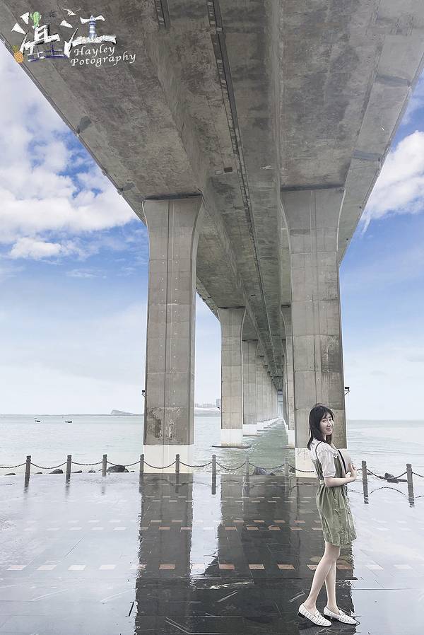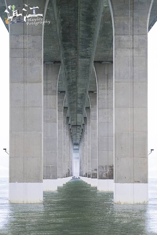 夏天的浪漫,就是突然下了一场雷暴雨,而我们在桥底下撑着伞,从阴云等到天晴 ……眼前海湾大桥桥底对称式的桥墩,成为了网红必打卡点。站在马路边望着一眼望不到尽头、层层叠叠对称结构十足的桥墩,会有一种未知的神秘与好奇的感觉。总觉得如果可以走过去,尽头有可能是另一个世界,就像大海之门无限延伸的即视感!在冒雨拍的时候,意外有一艘货船驶过桥墩之间,被我捕抓了下来。看着这张独特视觉效果的照片,虚虚实实间,给人一种魔幻的穿越感的同时,也有眼前一亮的感觉……有一段时间雨下得超级大,海面浮现了一层朦胧的雨雾,盯着对称式的桥墩和雨雾,忽然那一刹那有种会传送到另一个地方的沉浸式体验……由于当地处于频繁强风强震的环境,海湾大桥在塔形构思时,采用的是A字形等具有空间稳定几何形态的结构形式,满足结构受力需要的同时,也与城市环境相和谐统一。而桥面上的塔柱设计成曲线火炬状主塔,并向顶端凝,使整个主塔具有火炬状升腾气势!当天空逐渐放晴,海天就快一色时,海湾大桥就像一道横贯海湾的长虹,更显庄严宏伟、气势磅礴。而我站在海岸边黑色的石头上,映衬着渺小的我……在这里拍照出片率挺高的,放眼望去,对岸建筑、越麻斜海湾、桥梁汇成一张好看的明信片…停雨后走在北边的 广州 湾大道,回望远处的海湾大桥,仿佛笼罩在朦胧之中,更添几分美感。这里也是欣赏和拍摄海湾大桥的绝佳位置。这里人少景美,就像闯进一片隐秘的海边公路,隔海遥望海天相接的海湾大桥,呼吸着雨后深深浅浅的蓝,总觉得像吃了颗清爽薄荷糖般~ 眼前一望无际的大海上,一艘艘货船正缓缓驶向湛江港,留下一条条闪光的水带。今天的记忆是带着海水味道的…… ☆·.¸¸.·´¯`·.¸¸ 走进这里,仿佛有种美妙的错觉,就像在明暗交织的光线里与时光对话……