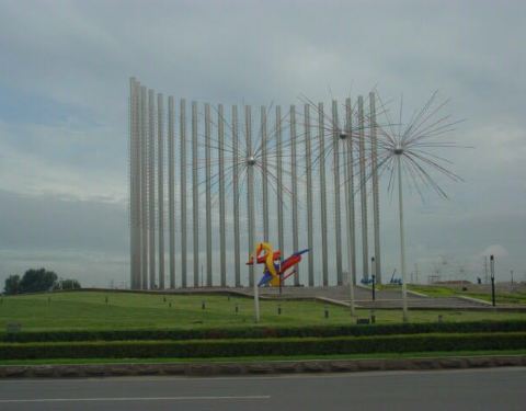六条道路的交汇处,现代气息浓厚的广场上摆放着象征国泰民安的雕塑。