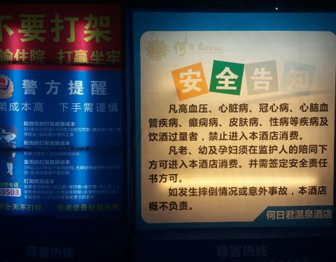 何日君温泉水疗应该是成都最早、最大的温泉水疗酒店了吧,在成都是非常有名气的。进去会换拖鞋,门口有注意事项。这里有吃的、有耍的、有温泉泡,温泉是男女分开泡的。温泉水温传感器合适,会有工作人员定时测量水温,水很干净。为了保护顾客隐私,温泉池禁止拍照,我是半夜去和工作人员确认好没有人并且她们同意后才拍了一张的。在何日君耍一天、睡一晚相当不错,希望还能来!休息区电视信号太差了,又麻又看不清,请换成机顶盒改善一下!