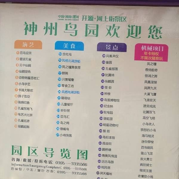 差评,绝对的差评,就这1颗星还是看在“神州”的面子上给的。4月中旬说有免费领取门票活动,于是各种转发终于满足条件能够领取门票了。坐了几个小时火车终于到了漯河,到了这神州鸟园,还真是个“鸟园”,真是“来了后悔一辈子”啊!刚开始到的比较早,还没上班,见售票处有人就问了一下网上抢的票在哪里领,接待员冷冷的回了句“还没上班”就把小窗户关了。等到上班了再问,说是在北门领。因为对这里不熟,就打车过去,花了十几块钱。终于到北门了,找到售票窗口,跟接待员说是微信抢的票,人家又让排队等,一等就是半个多小时。终于到了,跟接待员说是朋友在微信上帮忙抢的,接待员就一脸不屑,说要看微信上的二维码,自己不知道怎么操作就让她帮忙操作弄一下,结果她弄了一两分钟,也没弄成,然后就说“太麻烦了,你还是买票吧”。当时气就来了,说好的免费领门票,结果还要自己掏钱,谁知道接待员紧接着就跟了句“要买就赶紧,不买别挡下一位”。大家说说这多气人,说好的免费领,到头来费这么大劲还得掏钱,完全是个骗局啊!110的门票谁掏不起,说的跟这鸟园多了不起一样,一个主题公园连个景区都不算还装大以巴狼,真有意思。讲真的,110花的冤啊,还真是个“鸟园”--“鸟不拉屎的公园”。地广鸟稀,没几种鸟,一个手掌都能数得过来,真不值得参观。说实在的,就这样一个公园还收费,真是滑天下之大稽!