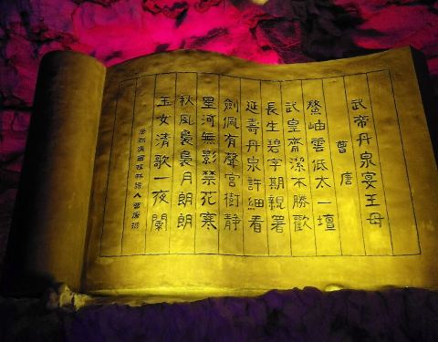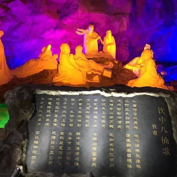 《洞天酒海五万吨》世界最大酒洞深,迂回六里藏珍品,古树化石溶洞美,洞天酒海五万吨。金屋藏了六千吨,海枯石烂两千吨,八仙干了难过海,谪仙喝了诗不成。