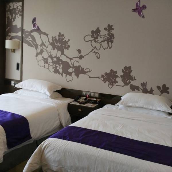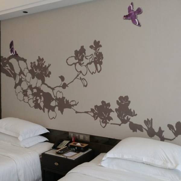 床头那边的主墙的墙纸是淡紫色的花和鸟图案,床尾的衬条也是紫色的,挺温馨且高雅的色调。