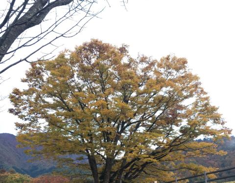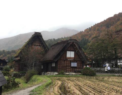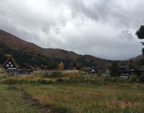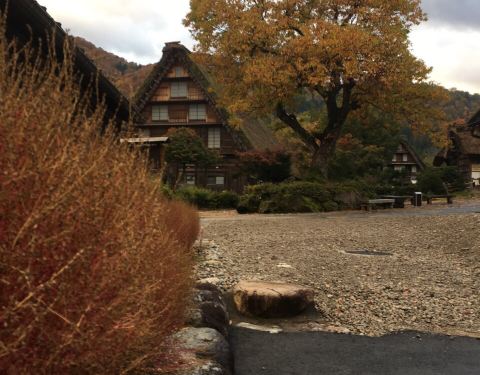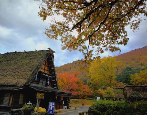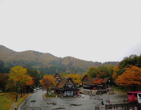 ...时的大巴车,来到美丽的白川乡,像走入油画世界里面,山峦包围着一休的故乡,呈现出黄色,红色,绿色