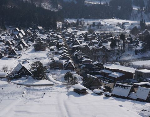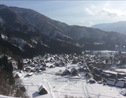 从这里可以俯瞰整个合掌村,中午的阳光很灿烂,照在白白的雪上很漂亮!从展望台俯瞰白川乡,更能看到乡村的特点,房子建设的与众不同。