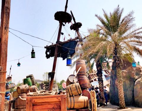 这里的主题是加勒比海盗的故事,景点叫宝藏湾。没有什么游戏项目。主要是一些可以拍照的景点。人不是很多。更多的人喜欢玩乐。这里是拍照的好地方。