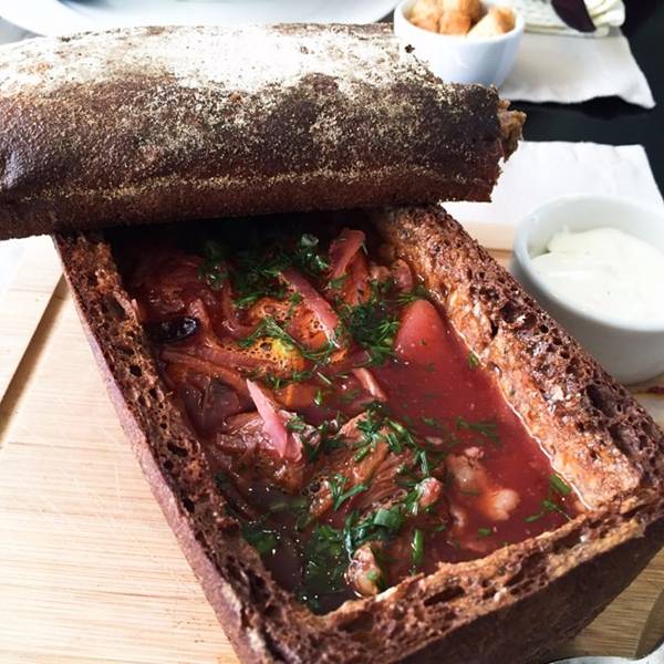 我们的参观路线如下图,从火车站开始, 先到F点是C-56和凯旋门一带折返走到往B点走,这里要爬个小坡,路边有很多好玩的酒吧。我们本来是打算去吃ZUMA的,但是走到B点时就饿了,于是附近找了一家饭店叫MOLOKO&MED,没有想到吃到了此行最美味的红菜汤。这个装在面包里的红菜汤加了羊肉,浓郁鲜香,真的是回味无穷,强烈推荐!我们沿着马路往海边走(C点)途经阿德米拉拉•佛基纳(喷泉街)Ул.Адмирала Фокина,本来看攻略说一路上有很多好看的喷泉,可是冬天看到的景象就是路上一坨坨白色冻住的不明物体。。。无法脑补他们都是喷泉。。。