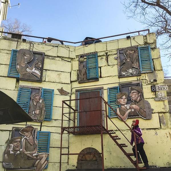 折返走到往B点走,这里要爬个小坡,路边有很多好玩的酒吧。 海参威一共有3家1号食堂。市区闲逛遇见美食