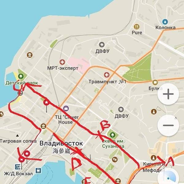 从火车站出发,沿着阿列乌茨卡亚大街 Ул.Алеутская向北走到斯维特兰斯卡亚Ул.Светланская路口,往右手边沿着岸边继续走,可以看到各种船舶,雕塑,C-56也在这条街。 马路对面是商场和饭店。走过大概1,2个路口,留意看在马路左边有MTC等几家店铺(下下下下图D点),门面都不大,不要错过哦海上结了薄薄的一层冰,冰面上还聚集了一些海鸟一直往东走,路过C-56和凯旋门我们本来要去瞭望塔(A点) ,就在这条街走到底然后往北走上山,但是因为小伙伴的鞋子不利于爬坡,我们就没有登顶,很可惜没有看到金角湾的全景。