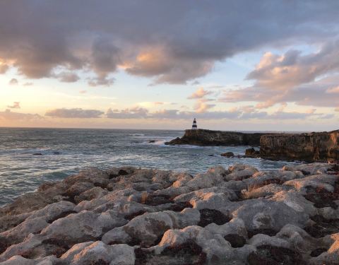 到了Robe,正是落日的时间。 在Robe obelisk看到夕阳西下。也一样是悬崖峭壁,海涛汹涌的拍打着,泛着泡沫。 Robe有很奇怪的地理特性,应该都是石灰岩,有各种奇怪的形状,长满了特别的植物。 因为有很厚的乌云,所以日落时象是黑天。