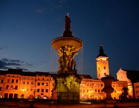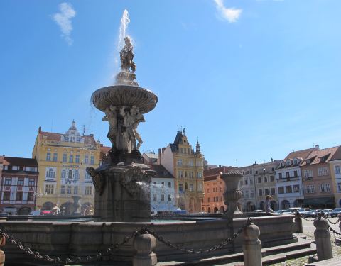 捷克布杰約维采,老城广场,城市有着数百年的历史,老城广场,环绕着中世纪的建筑,餐馆酒吧又流淌着现代气息,广场中央,参孙喷泉,20多米高,捷克最高的喷泉,塑像顶部是大力士参孙