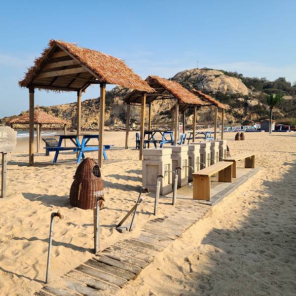 傍晚天氣較冷,海灘上沒有遊客,整個景區規劃很好,夏天的聖地,小孩遊樂設施、遮陽亭、可愛垃圾桶、洗腳區、沙灘排球、各台灣特色商店。 晚上住的名宿離公交站不遠,算在島中心位置,晚餐可到附近農貿市場解決,有飲料店、速食店、水果店、海產店、便利店,一次搞定所有需求。