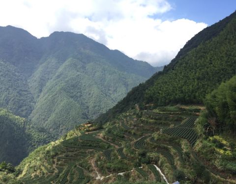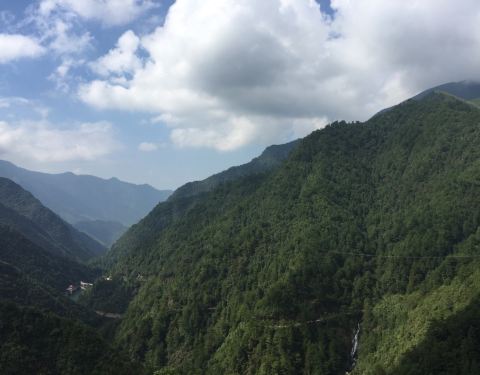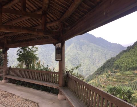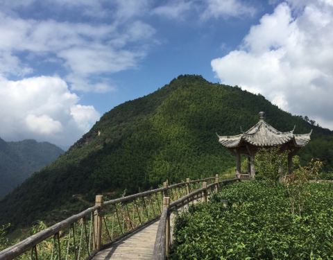 龙泉山景区门口的一处高山村落,可作为进入景区前的补给站。公路两边有好多农家乐,吃饭住宿都有,适逢饭点随意选了一家,吃了野猪肉,那肉质那口感绝对是一头常年奔跑的猪。村子中间有一处观景平台,坐在连廊下,吹着阵阵凉风俯瞰连绵的山脉全景,心旷神怡。继续往前猕猴谷方向,有一条依山而建的步栈道,走走停停看看山下的茶园,景色好美。通往猕猴谷方向一路直下,体力不支走了一半就回头了。