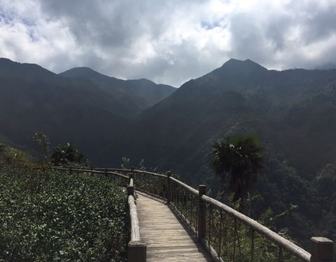 继续往前猕猴谷方向,有一条依山而建的步栈道,走走停停看看山下的茶园,景色好美