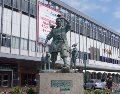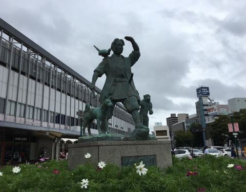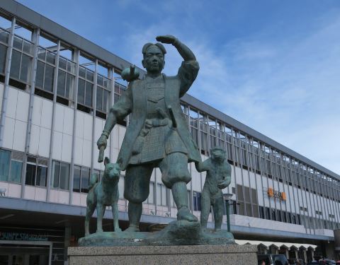 冈山站的前面广场就矗立了一尊桃太郎的铜像,有他的小伙伴猴子和狗,肩膀上还有一只鸟