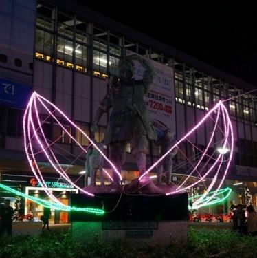 更是在冈山站前的广场上修了一座桃太郎像。晚上会亮灯哦