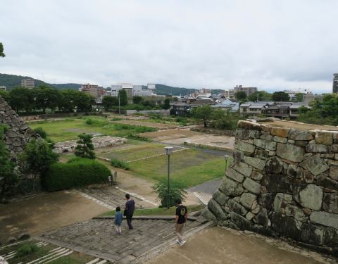 要登上冈山层的天守阁就得先经过乌城公园,其实就是冈山城前面的那一大片区域。明治时代修建的御殿、橹和门现在都也不见踪影,护城河也只剩下了内崛,大多被埋没了。公园的草坪上就有一些以前建筑的石基,在角落处还有一些穴藏的遗迹。