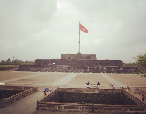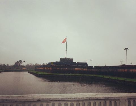 皇城的对面是大旗台,旗台分为三层,旗台上挂着超大的越南国旗,因为太大太重,风不大时,根本吹不起来~回去路上又开始下雨,遇到被旅行团承包的“客先死”,在街上排成长长的一字,那阵容很是壮观,仿佛十二点钟以后顺化街头他们说了算的那种气势!今天最悲催的事情就是剩下唯一的一张100美元被雨水打湿,边角又被钱包染了色,换钱的要么不收,那么折价收!大概意思就是90元收旧的脏的100元人民币啊,量大的话95元收,没有我不敢收,就怕你没货,各位有没有要出的? 不过现在我终于明白为啥越南的钱要用塑料来制作!雨水太多了...太多了...