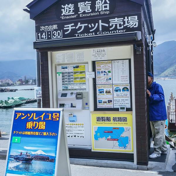 买船票,沿河行驶,欣赏富士山美景同时感受湖泊的意境