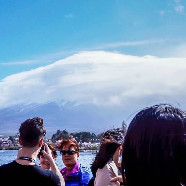 从天上山公园出来之后,对面就是乘坐游览船的地方。 游览船会绕着河口湖转一圈,航程20分钟左右,官网上可以查询到发船的时间。 我们出发时还能隐约看到富士山的轮廓,等回程的时候就只剩一片云雾了, 这一天接下来的时间我们都与富士山无缘 T^T乘船处,每个整点和半点会发船岸边的樱花相继盛开大家争先恐后地与富士山合影隐身的富士山 ,不过河岸的樱花真的是很美了~~~