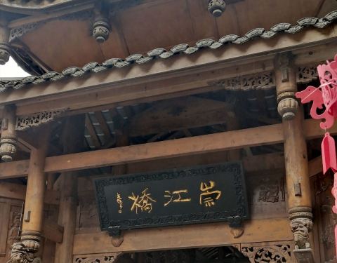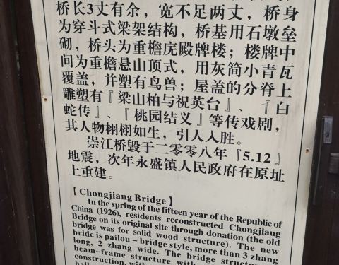 一个不大的小景区,游客不多,街道上和院落是古香古色的建筑风格,一座“崇江桥”,建于民国十五年,楼桥款式,桥长三丈有余,宽不足两丈。