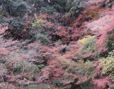 九年庵位于佐贺县神埼市的北边,是红叶的名胜,一年只在秋天开放一次,开放时间共9天。我们也针对这时节做了旅游计划。我们从神埼站前坐公车到任比山神社下车。很可能是开放的时间的原因,那天不是周末,天气又不太好,我们到的时候人也特别多,要先去附近广场发号排队,等了半小时左右才可以移动到九年庵。参观九年庵限制不少,只能在木道上按固定好的参观路线跟着大家单向行走,不能随便从院子里走到从自己喜欢的角度看,而且,木道很窄,不让用三脚架拍摄。可这里的红叶真美,颜色真红,那天不巧阳光不够好,但还是颜色相当鲜艳。九年庵本身不大,边拍照边慢慢走,也还是不到30分就出来了。旁边有任比山神社,这里也能看到红叶,这里可以不受限制看红叶,顺便访问也不错。