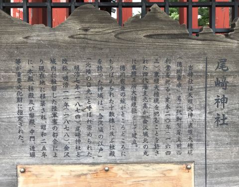 尾崎神社原本在金泽城,后来移到金泽城与尾山神社之间,主祭天照大神、德川家康、前田利常,但因德川家康才是真人中的权力所在,所以主祭就是德川家康