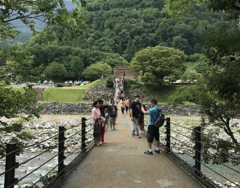 相逢桥是进合掌村的必经之路,这是一座链接岐阜巴士站和白川乡荻町的铁索吊桥。桥长107米,宽由两端向中央15-40米。桥下是庄川,站在桥上看庄川两岸景色,非常美。两岸是五箇山。在白川乡里面没有感觉到人多,但在桥上就不一样了,有时照相都费劲