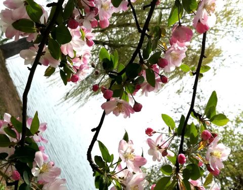 ''醉美赏花地,东海西双湖, 杨柳忙堆烟,红梅蘸水开!