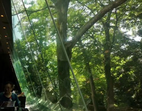 【东游东瀛】石川縣立美术馆:美术馆不能摄影,只得在高颜值超大落地窗的咖啡厅留影几张~午餐美而简,甜品也可心,呵呵→_→醉在绿荫里……