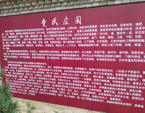 绥德党氏庄园始建于公元1814年,是文化大县绥德唯一保存较完整的清代建筑。山庄为典型的陕北大户民宅,窑洞鳞次栉比、错落有序地分布在山坡上。大门、影壁、门窗上配有精美的石雕、砖雕和木雕。 党氏庄园规模较大,气势壮观,装饰精细,构思巧妙,散发着黄土高坡传统文化的精神、气质、神韵。
