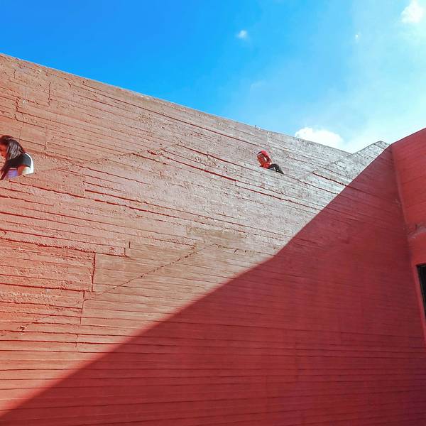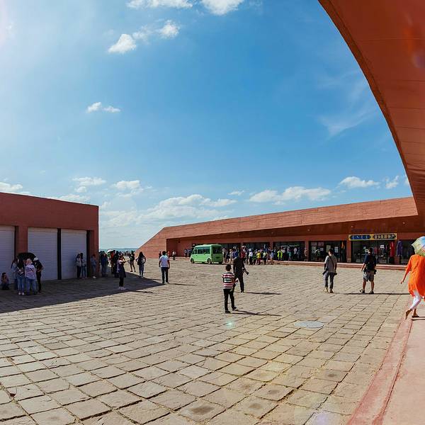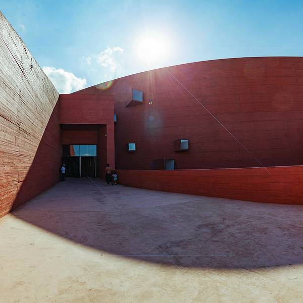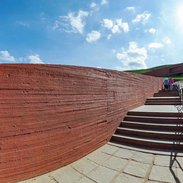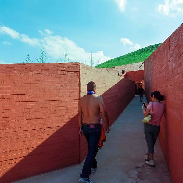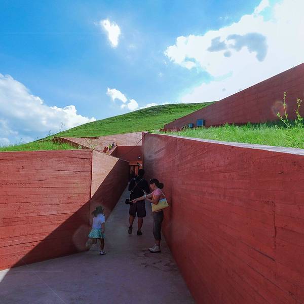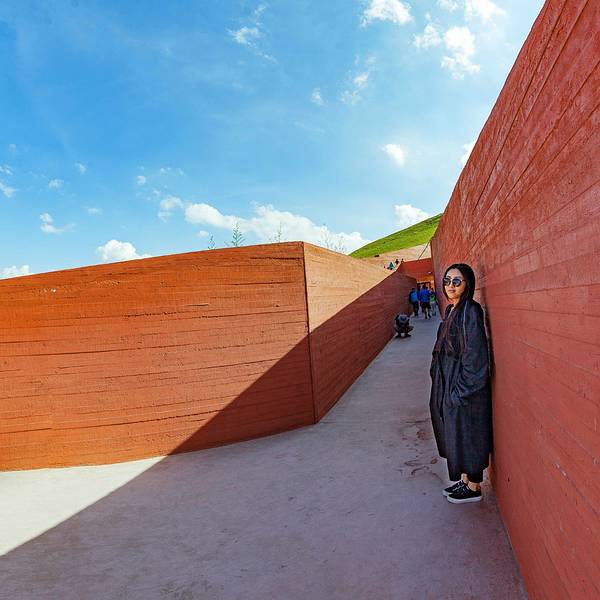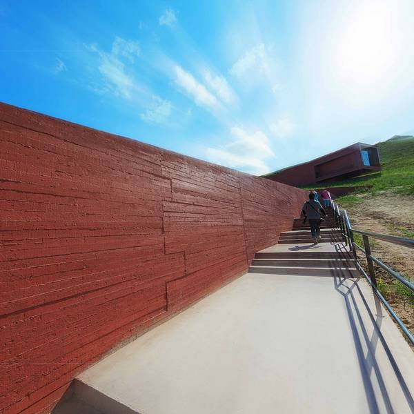 游客接待中心设置在乌兰台西南侧山脚面向游客前来的方向,采用覆土的方式将建筑全部隐藏,只留出进入庭院的开口挡墙,可由庭院通过室外阶梯上至屋顶草坡。元上都遗址博物馆游客接待中心入口。元上都遗址博物馆游客接待中心一瞥。“乌兰”在蒙古语中是“红色”的意思,在乌兰台山体裸露的地方和敖包上面随处可见红色的山石,“乌兰台”应该即是一座“红色山岩之上的烽火台”之意。后来建筑施工过程中开挖的山体的确是由红色的山岩构成。因此,建筑主体的外墙和平台、挡墙都采用了一种掺氧化铁骨料的清水混凝土,使外露的建筑体量呈现出一种斑驳的红色,犹如从山体中延伸而出,与四季变化的草原丘陵相应和,呈现出广袤与苍凉的场所气质。元上都遗址博物馆总建筑面积6991平方米,主体建筑5701平方米,是镶嵌在山体中的地上地下各两层的覆土式建筑。整个设计结合并充分利用废弃的采矿场来布置博物馆的建筑主体,以修整被采矿破坏的山体——博物馆工作人员入口设置在一处折线形采矿条坑南端,并将办公考古科研用房沿折线凹地布置,且沿山坡形状覆土;保留另一处现状圆形矿坑,修整作为博物馆的下沉庭院,游客服务区环绕着此庭院。在利用圆形矿坑建造的下沉庭院中仰望……遵循对文化遗产环境完整性的最小干预原则,李兴钢先生将大部分建筑体量掩藏在山体之内,仅半露一小段长条形体,隐喻遗址的城垣,将其由正北向东旋转18度,与山体等高线相交,并指向元上都遗址中轴线上的起点——明德门,使建筑对遗址有理想的视角和轴线关联;而由明德门处看遗址博物馆,建筑则缩为一个隐约的方点,体现出对遗址环境完整性的尊重以及人工与自然的恰切对话和协调。元上都遗址博物馆入口。沿着博物馆的内外参观路径,李兴钢先生设置了一系列远眺遗址和草原丘陵地景的平台,直至到达山顶敖包,长长的路径和不断停驻的平台,是博物馆不可分割的组成部分,将元上都的历史、文化和景观在此串联。参观游览元上都遗址博物馆是免费的,但从游客中心到博物馆还有几公里路,得乘坐收费的往返电瓶车。元上都遗址博物馆爬山步道。博物馆参观途中不同高度的平台回望景色之一。博物馆参观途中不同高度的平台回望景色之一。博物馆参观途中最高的平台回望:远处起伏的山丘脚下的草原,就是元上都遗址。 展开