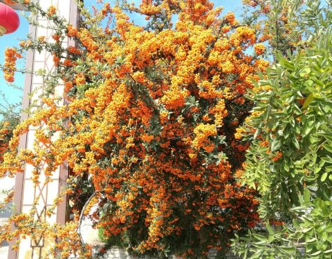秋天的下午,阳光明媚,登上垛顶山,远眺大海,海天一色,心旷神怡。山下几棵火棘树,果实累累
