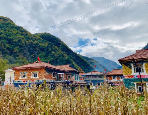 离开黑水县的前的最后一站,彩林和红叶比洛哩措湖更艳丽些,仍然是人工景点,但是在彩林环山的怀抱下,一幢幢色彩缤纷的小屋舍显得格外漂亮,忍不住不停的嚓嚓嚓按动快门。屋舍的一侧有着不知名的红花绿植金色的稲麦,在镜头中近、中、远三个层次,拍出来特别好看。