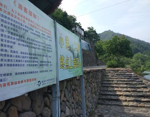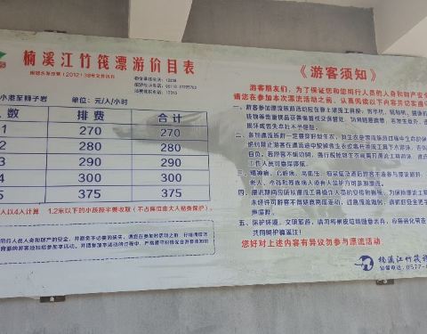 楠溪江的漂流点有好几个,有二桥、三桥等,我们选择了小港至狮子岩,单程收费, 1-5人收费分别为270元、280元、290元、300元、375元,1米2以下半票,不占座由大人贴身保护。 上竹筏前,岸边有红色的漂流提示牌,...
