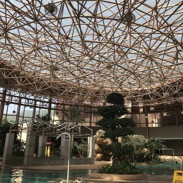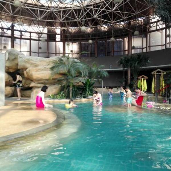 温泉就在酒店旁边,换上浴袍就可以出门了,我们买的是酒店加温泉的套票,温泉会馆换好手牌经过更衣室,大型室内温泉浴池看起来很开阔,采光效果非常好,里面很多娱乐项目,按摩冲浪,还可以租游泳设备,水也不深,比较适合亲子游玩。