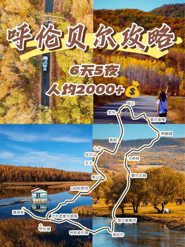 金秋呼伦贝尔6天5晚旅游攻略||呼伦贝尔是国内最早步入秋季的城市 这个时候,草原、森林都染上了金黄色 而且呼伦贝尔的秋只持续短短几个星期 如果想欣赏北国的秋,就抓紧时间吧! . 📍Day1:全国各地-海拉尔 📍Day2:海拉尔-穿越草原-莫日格勒河-额尔古纳-白桦林景区-恩和 📍Day3:恩和-室韦口岸-中俄边防公路-乌兰山-骑马-日落-篝火晚会-黑山头 📍Day4:黑山头-访牧户-国门-套娃景区-满洲里 📍Day5:满洲里-呼伦湖-甘珠尔庙-诺门罕战争遗址-阿尔山 📍Day6:阿尔山-阿尔山国家森林公园 📍Day7:阿尔山国家森林公园-玫瑰峰-诺干湖-返程海拉尔 . 🐄特色美食 烤羊腿:肉香、外焦、内嫩、干酥不腻,眼未见其物,香味已扑鼻 手把肉:手把肉是蒙古族千百年来的传统食品。其肉鲜嫩,原汁原味 草原白蘑:白蘑有多种食用方法,可以做馅、溜炒、涮锅等,也可以凉干长期食用。 奶豆腐:是蒙古族牧民家中常见的奶食品。其软韧牵丝为断,是宴席上的一道风味名菜 . 📍美景推荐 莫尔格勒河:呼伦贝尔大草原上最漂亮的河流 白桦林:南方无此树木,沿途也会见到很多野生白桦林,🍂金灿灿的落叶铺满了树林 186彩带河:中俄边境线上的景区,都有滑草项目,各有特色,高空秋千非常好玩 满洲里:中俄蒙三国交汇的城市,充满了异域风情,在这里仿佛置身俄罗斯街头,国门套娃广场都在这里,超级治愈的边境小城,夜景超美+俄餐国内天花板 室韦:俄罗斯民族乡,亲眼可见对面的俄罗斯村庄,也是边防卡线的起点 . 呼伦贝尔入秋较早,温度比内地低很多,做好保暖工作带好厚衣服 来呼伦贝尔选择当地包车最轻松省心,司机兼向导带你玩转呼伦贝尔