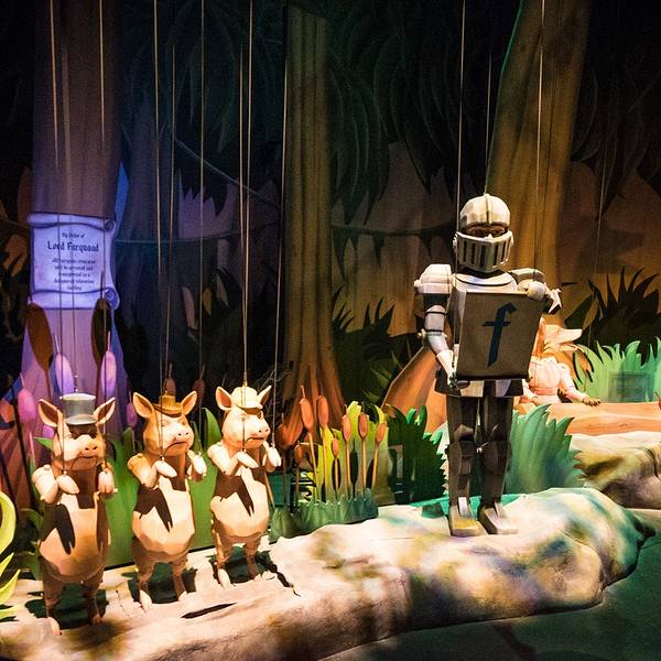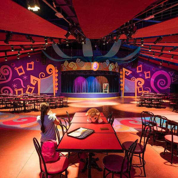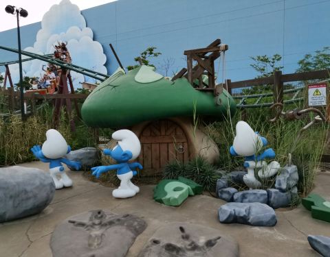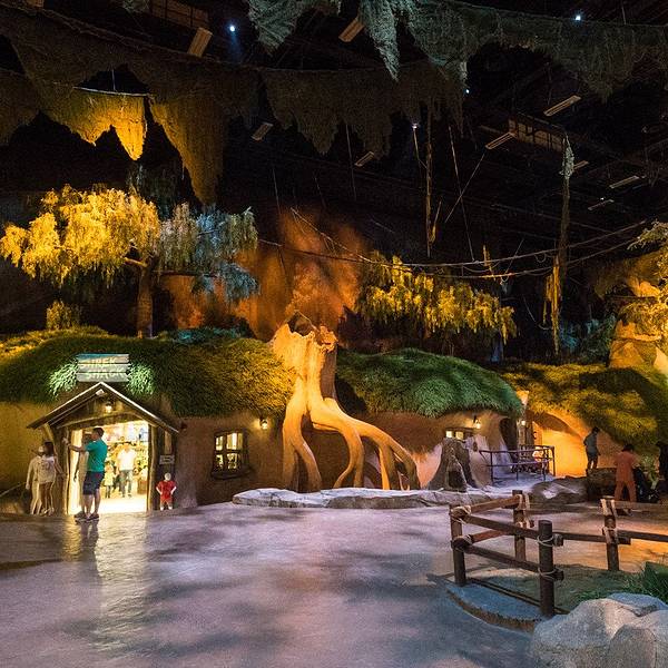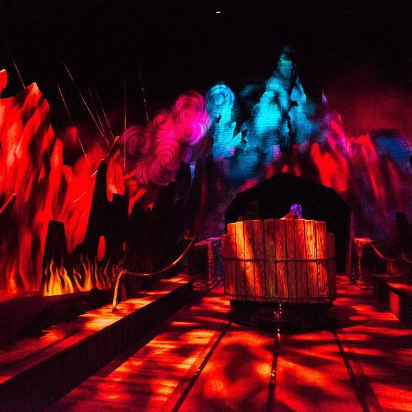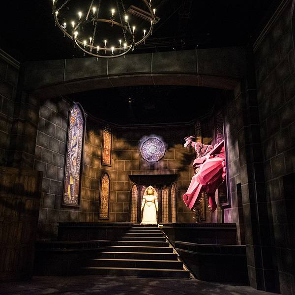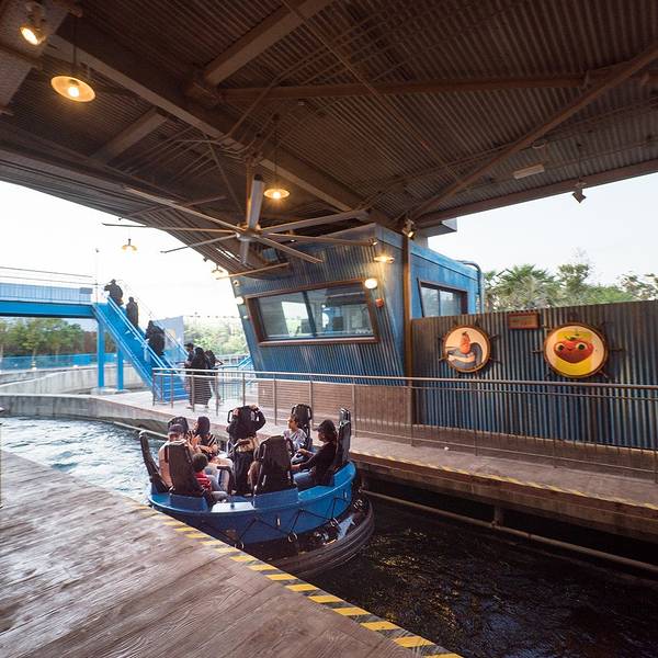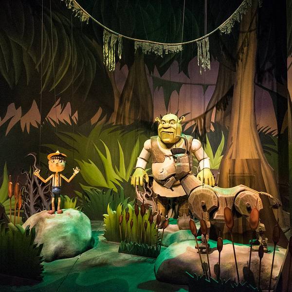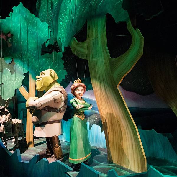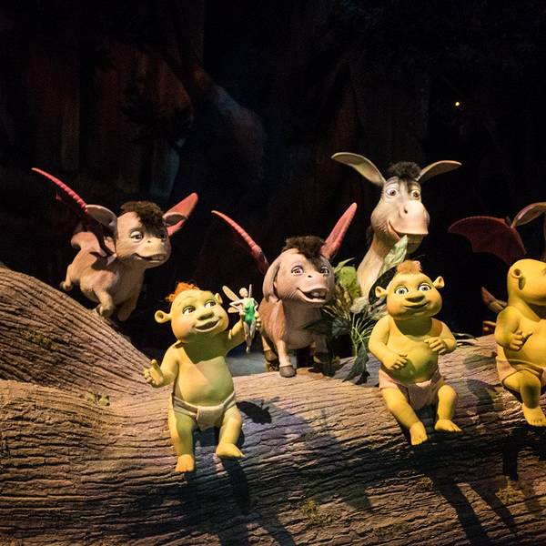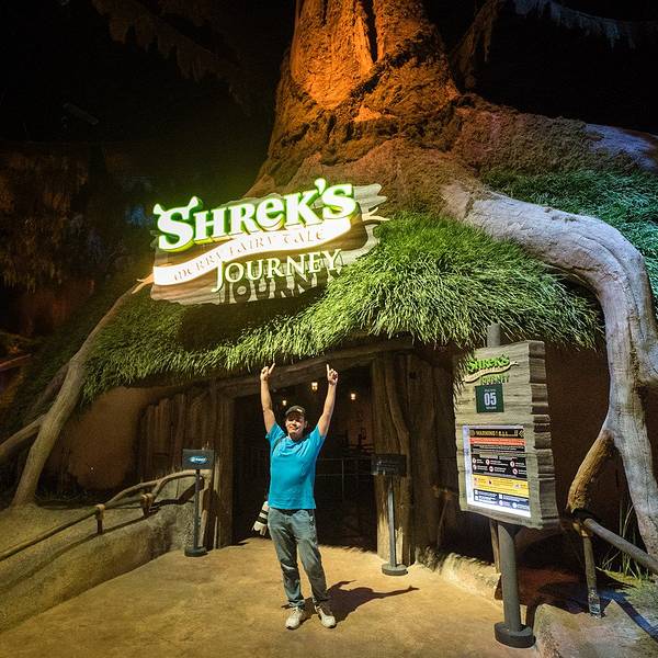 区内还有另一个以该电影为主题的设施,名为Swamp Celebration,适合家庭游客,届时你将坐在中间挖空做成的圆木上随水流漂浮旋转。这里的“人物”都是木质玩偶的材质展现的,显得很有质感。房间的灯光营造了一种神秘的氛围,好像和史瑞克并肩探险。