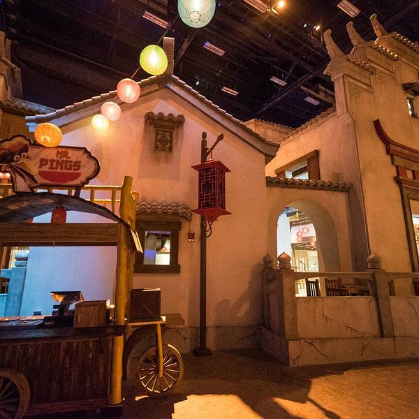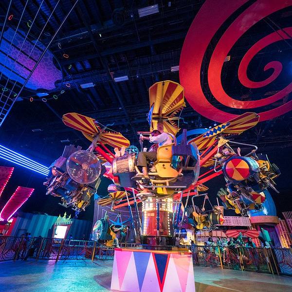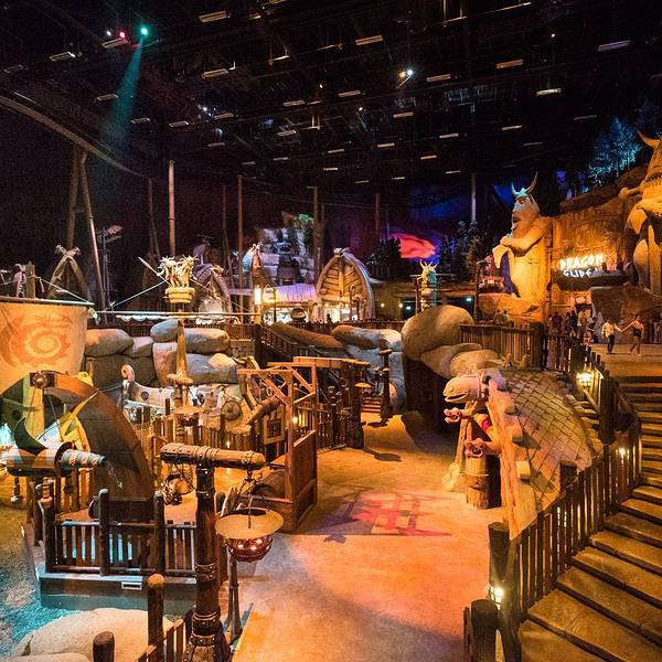怪物史瑞克陪了我们许多年,就算作为我这个年纪的人,也对它有着深厚的情感,或许这就是电影带给人们的情节。这房子看着不大,但里面可丰富了!实在不得不佩服这玩偶工艺的精湛了,所有的玩偶不仅精致,就连眼神都模仿的如此相似,史瑞克正戏谑的看着我!这个房间最奇妙地方,大概就是外观看起来很温馨娇小,但是进去了里面,就可以看到一个神奇而广阔的史瑞克世界吧,真的是对这里无比喜爱。继续往下走,来到《驯龙高手》的房间,看到高空的轨道没,这个房间竟然也有过山车!这不仅是个高空室内过山车,还会放电影让你回味剧情,之所以这么高就是让你体验,御龙飞行的感觉,简直太酷了。接下来我们来到了另一个大板块,这个板块,有很多刺激的游乐项目。第一个看到的就是《饥饿游戏》,一个经典的标志。这个由”饥饿游戏“打造的系列主题公园,有多处大小景观,让游客一进入园区就仿佛置身电影中,而公园的目的就是要让游客们可以在园区内展开“饥饿游戏”。看到上图的bullet train了吗?还记得女主Katniss坐的开往 美国 国会大厦的高速列车吗?这个叫做“国会大厦子弹列车”,这会让你像坐过山车一般刺激,只能任由它带领你去往各个方向,也许在你最不经意间它就转向了,官网称“带给你360度的战栗”。上车换轨,先倒行再冲刺,太刺激了!