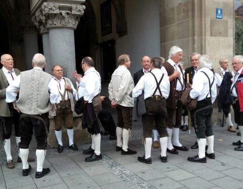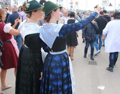 谷物市场是慕尼黑啤酒节的活动中心之一。是一个最好的互动场合。大厅里面布满了临时座位,盛满了美酒和美食。还有盛装的美女适应生。外面就是大家嘻哈和拍照的地方。节日气氛浓郁。