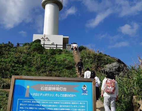 御神崎是位于石垣岛西端断崖绝壁的海角美景,据说是石垣岛欣赏夕阳的较佳地点。沿着石阶登上灯塔时,左边可眺望蔚蓝而又澎湃的海景,右边则是嶙峋的奇岩峭壁,还有海底美丽的珊瑚礁。