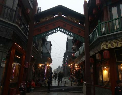 就在步行街的路口,标志性的建筑,都不是当初的了,但是尽量还原了原貌,到这里拍拍照,逛逛步行街,这几年来已经没有什么人来了,旁边就是北京坊,经常来
